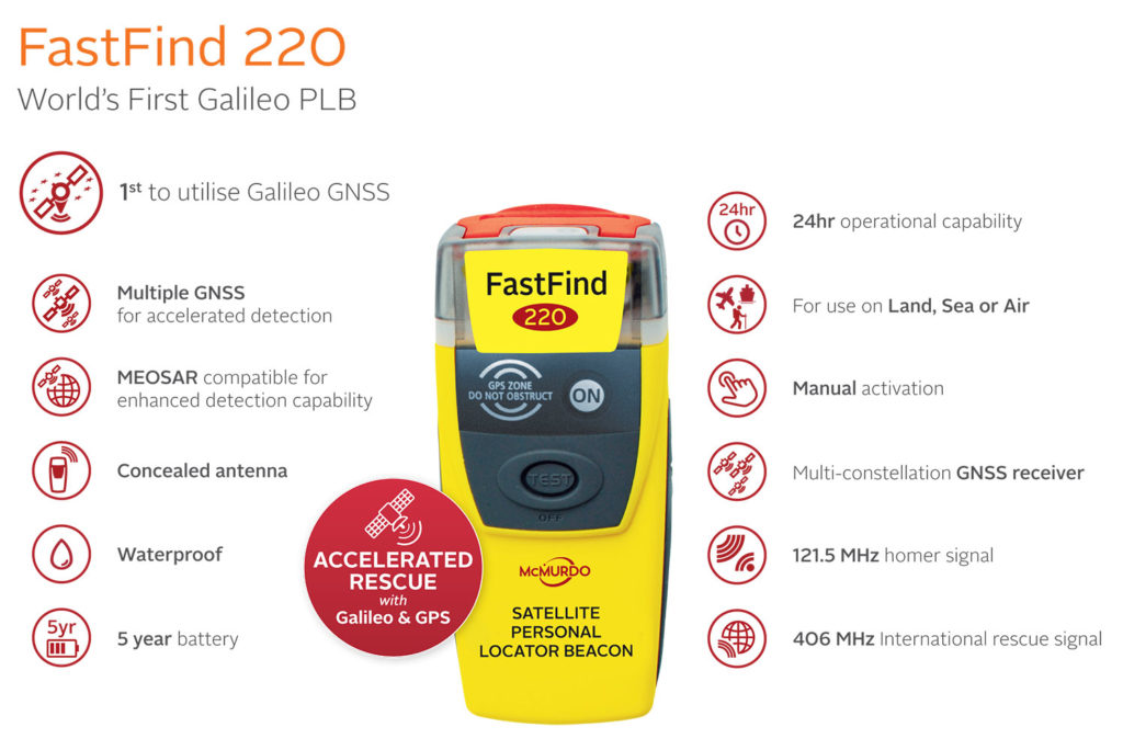 La balise personnelle McMurdo Fastfind 220 PLB (COSPAS-SARSAT) émet sur 406 MHz et 121,5 MHz et dispose d’un récepteur GPS intégré à 50 canaux.